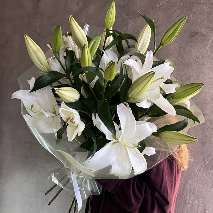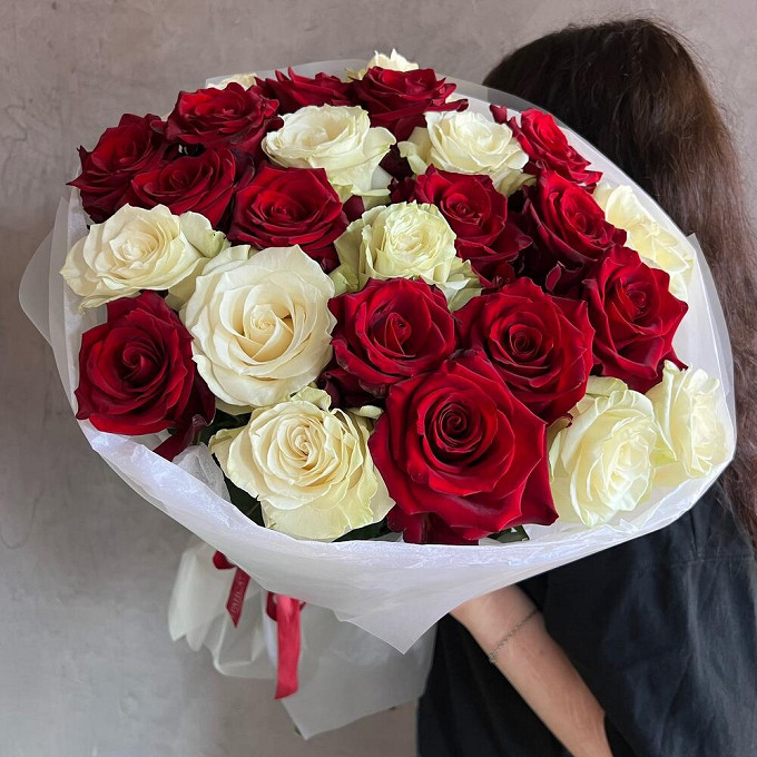 25 белых роз Кения, 50 см в красной матовой плёнке