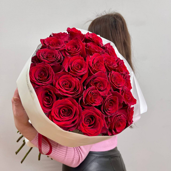 25 красных роз Кения, 40 см в зелёной матовой плёнке
